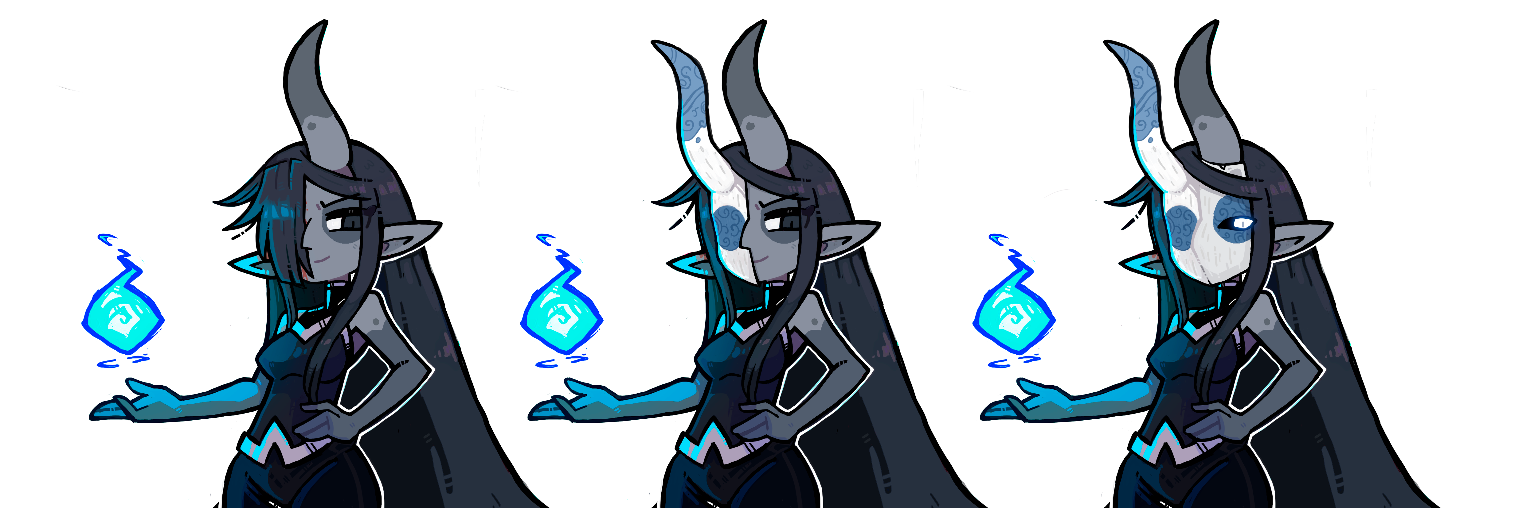 Narímine uses a mask composed of two independent halves; she can use only one to hide the side of her face covered with scars or join both together to form a complete mask when she goes on missions, seeks to intimidate, or needs to completely hide gestures and emotions.